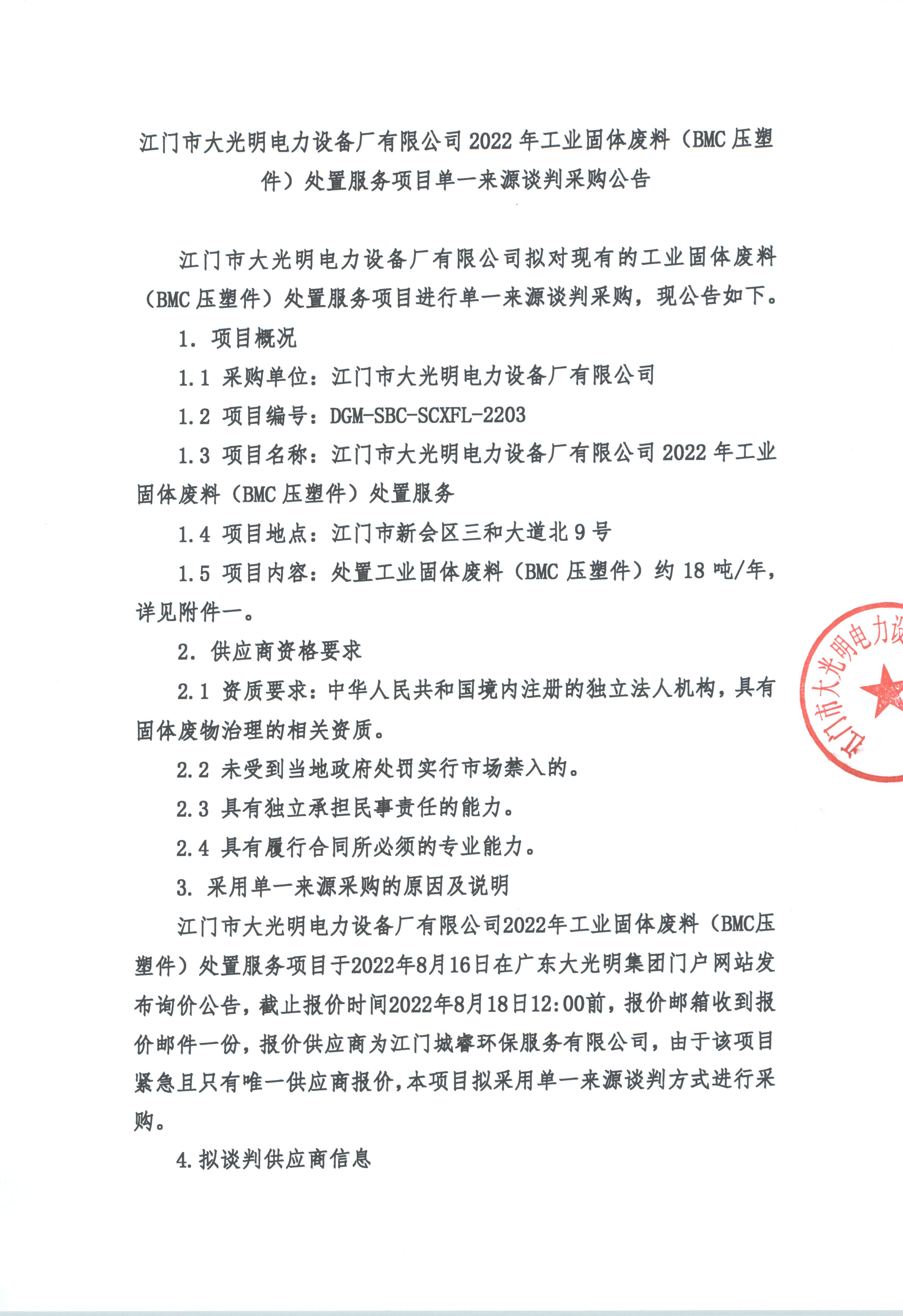 江門市金年会诚信至上電力設備廠有限公司2022年工業固體廢料(BMC壓塑件)處置服務項目單一來源談判采購公告
